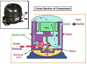 - It consists of an electrical motor that sucks in the refrigerant from the evaporator and compresses it to make a hot and high-pressure gas (coolant).