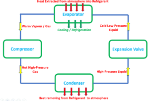 - Heat Transfer: The cycle relies on transferring heat from inside the cooled space to the environment outside it.