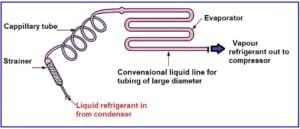 - The high-pressure liquid refrigerant then moves through a small opening called the expansion valve or capillary tube.